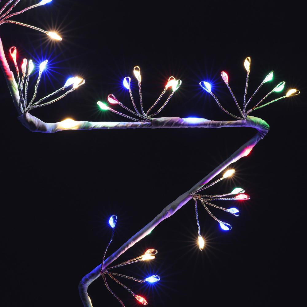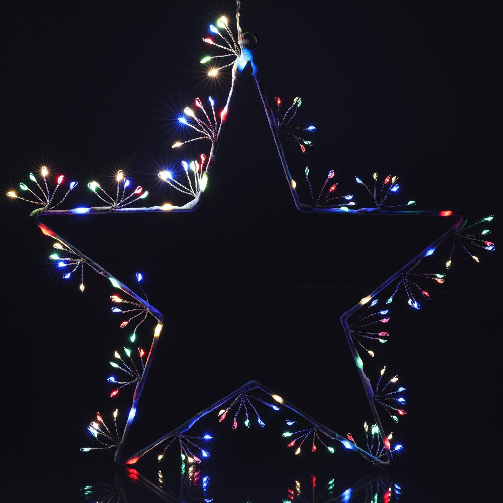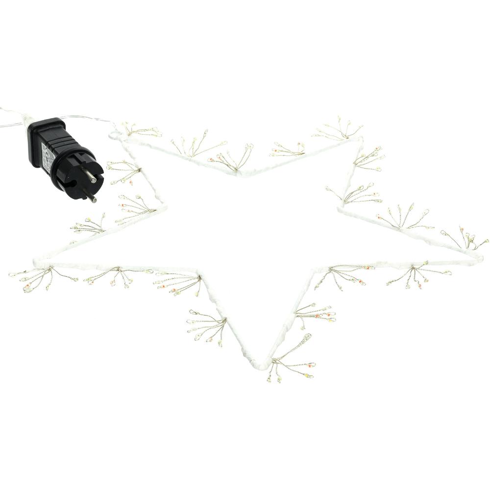 White star with 140 nano LED lights in pastel multi colour. Size of the star 35 cm, 3 m power cord. 6 strings from one place. The lights could be rotated in different ways. Use indoor and outdoor.