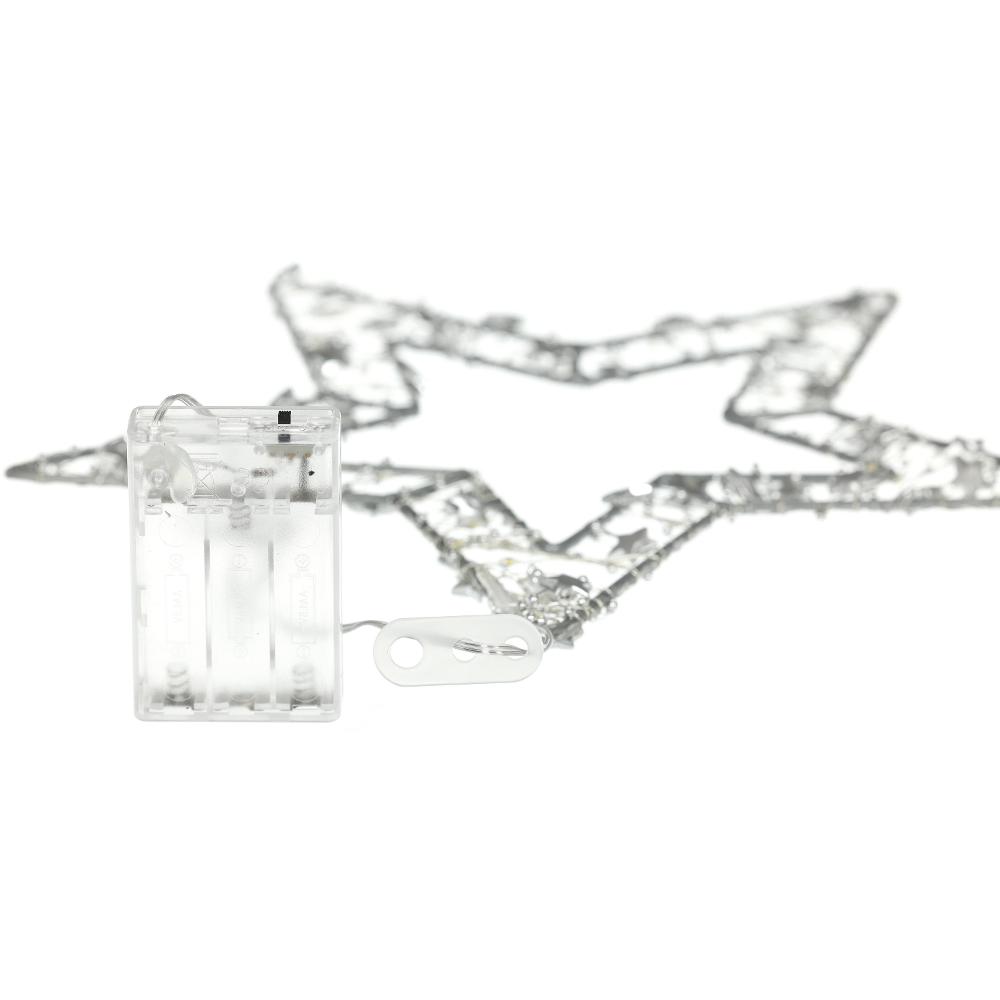 is a luminous Christmas decoration that you can usu to light your home.The size of the star is 30 cm and it lights up with 40 LED lights in warm white colour. It is complemented by small silever stars that support the light effect. 3 AA batteries are required to light up. Batteries are not included. Use only indoor.