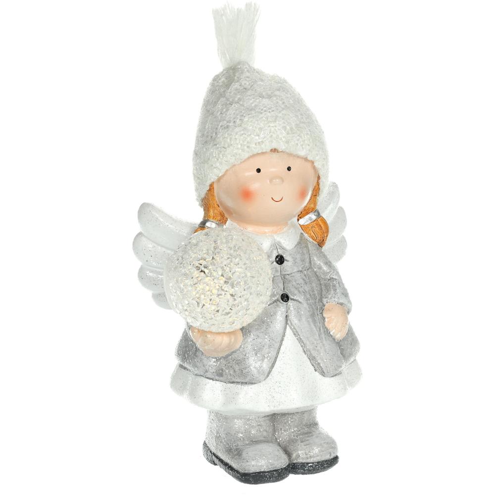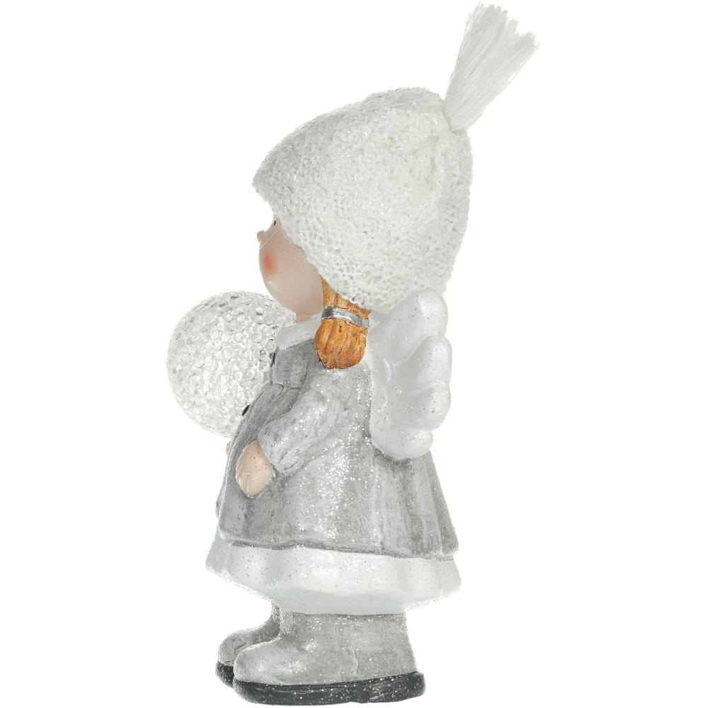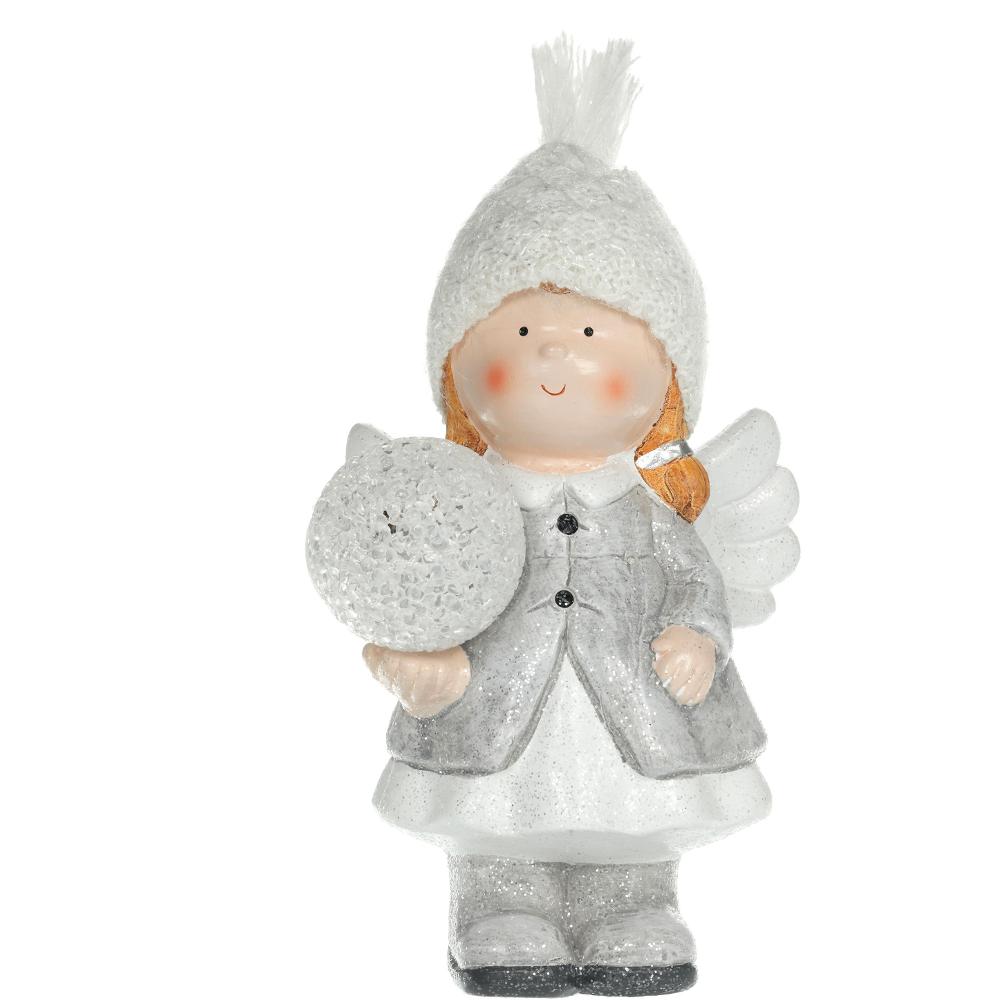 The angel from ceramics with snowball in the hand. After power on the snowball light up with 1 LED light in warm white colour. Size 12,8 x 11,5 x 21 cm. 2 LR44 batteroes are included. Use only indoor.