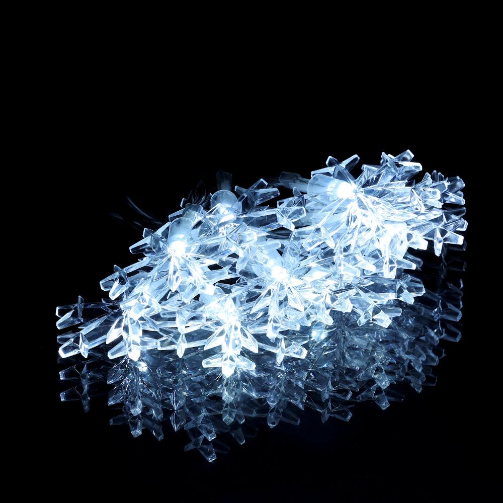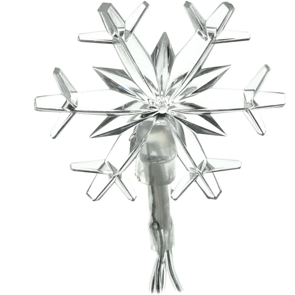 Garland with 10 plastic snowflakes lit up with 10 LED lights in cold white colour. Length of glowing part 1,35 m, size of the snowflake 4,5 cm, 0,3 m power cord. Timer. 2 AA batteries not included. Use only indoor.