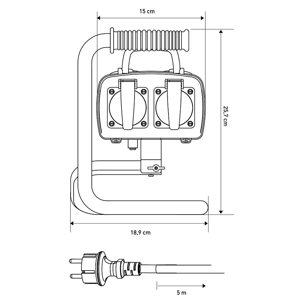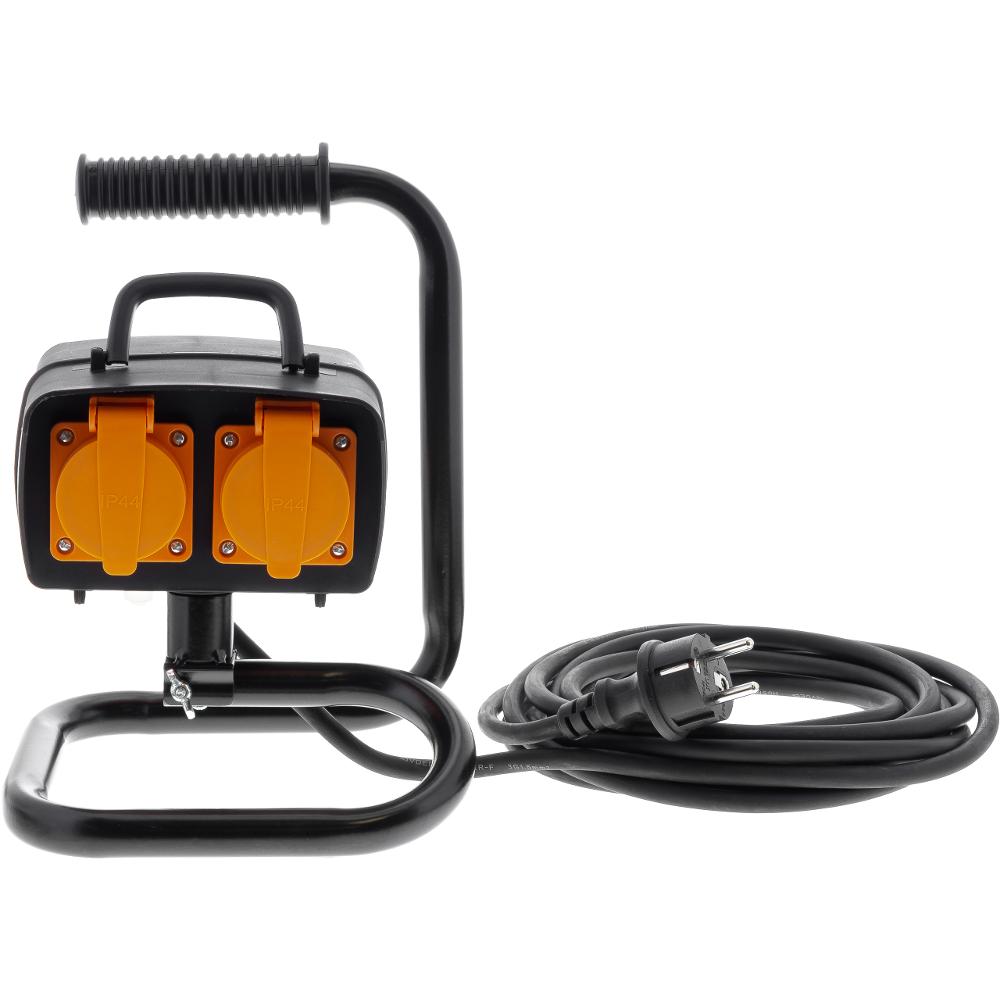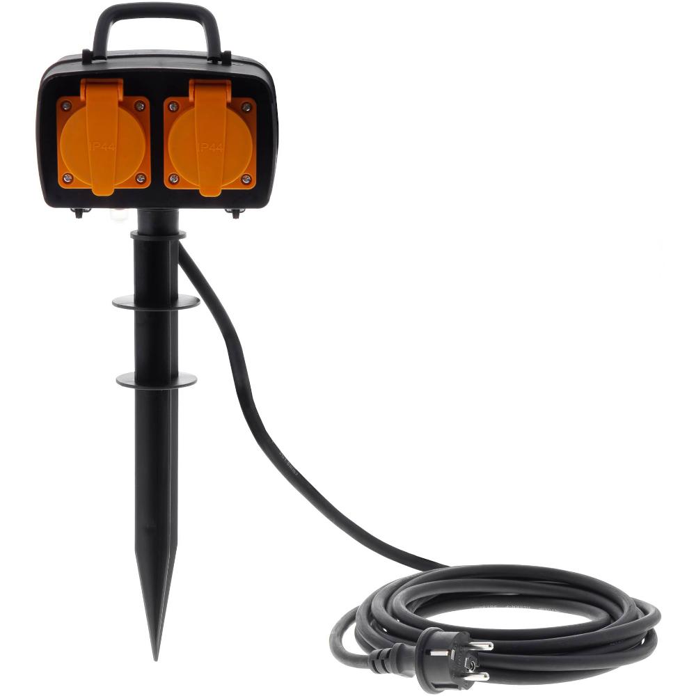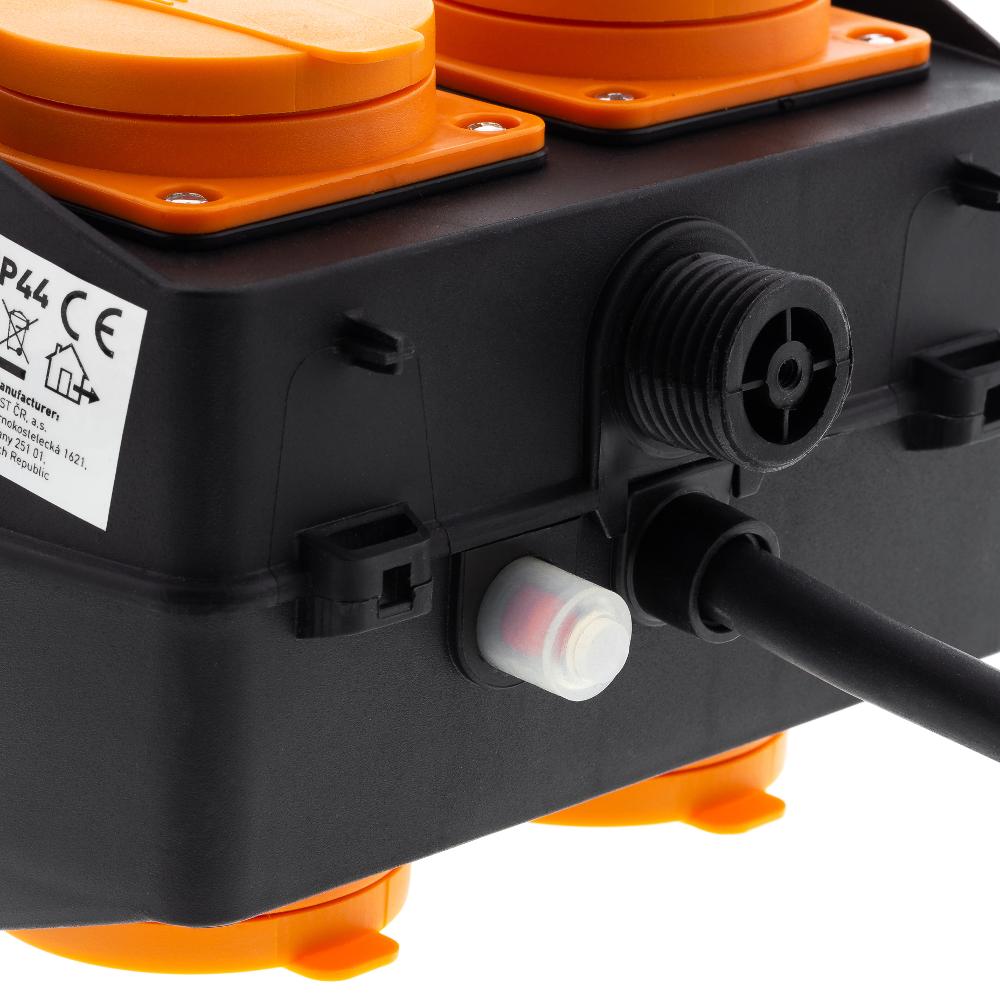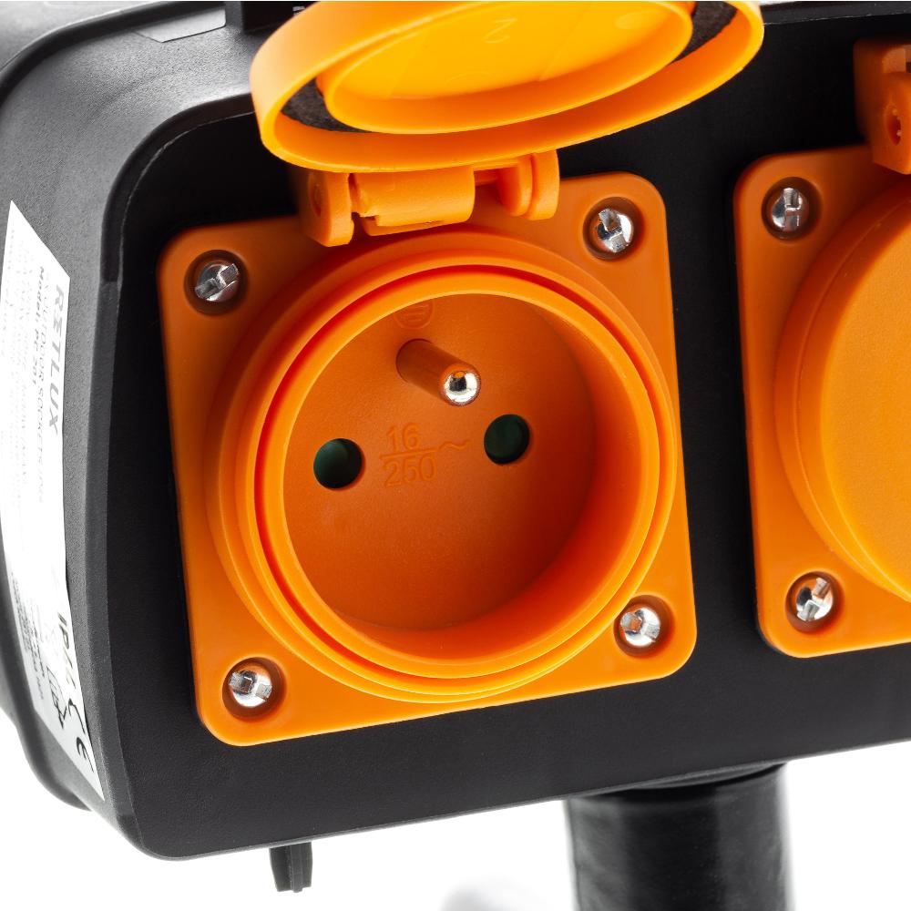 Outdoor cable socket, black/orange colour, IP44, 4x 230 / 16A / max. 3680W, metal stand with avalability to change with plastic spike (in packing),reversible current protection button, with 5 meter cable G3x1,5mm2., french type socket.