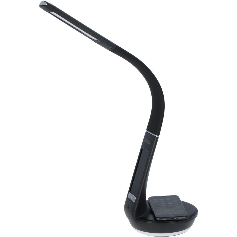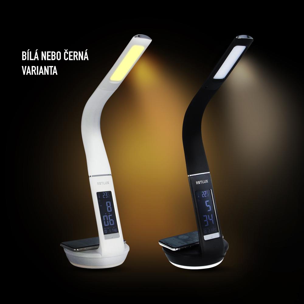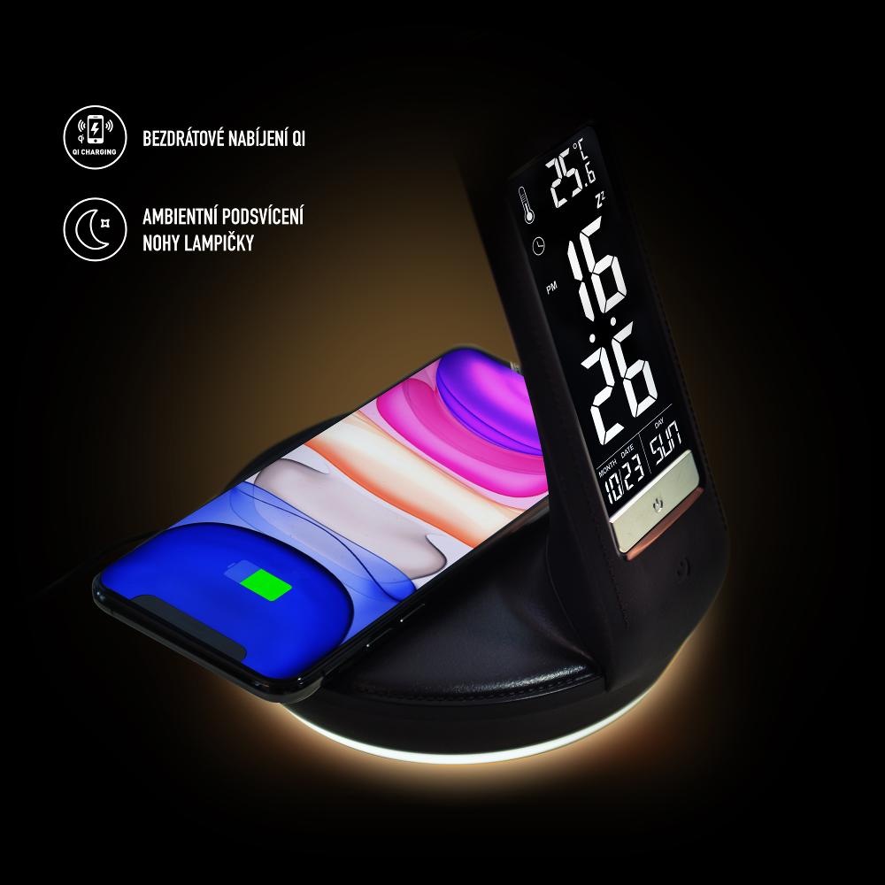 LED stolní lampička s ambientním podvícením, hodinami, kalendářem, teploměrem, bezdrátovým nabíjením Qi a USB výstupem.