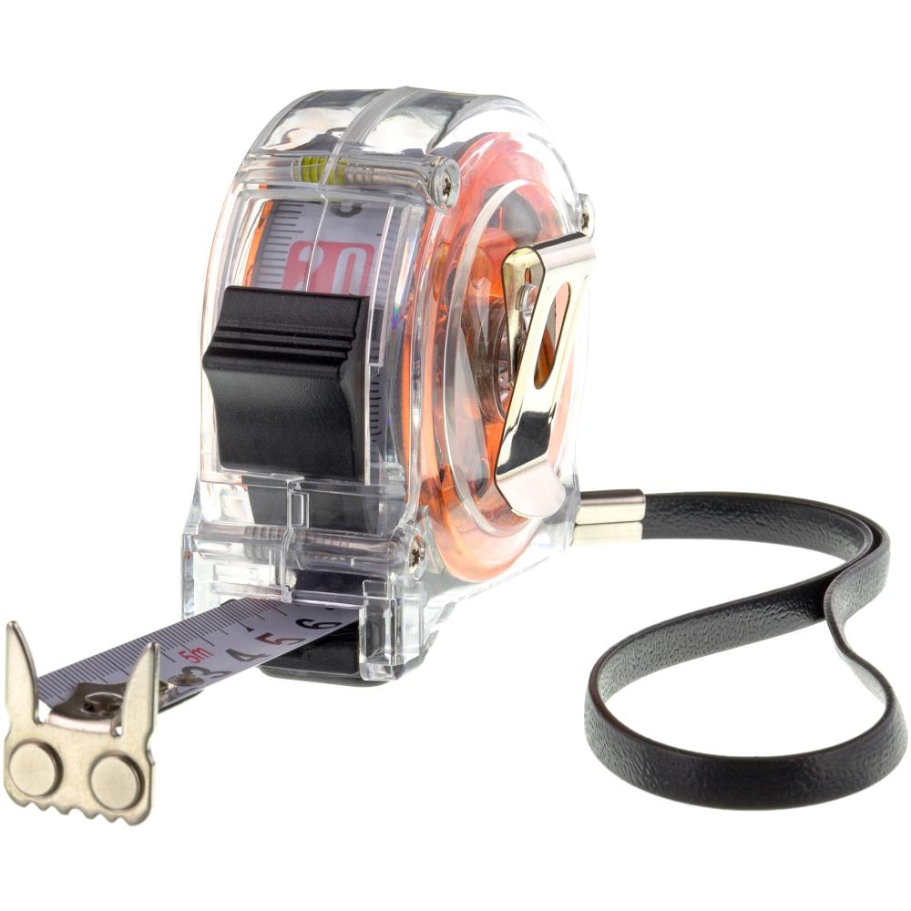 5m tape measure, transparent casing, two-sided scale, magnet end, anchoring clip,