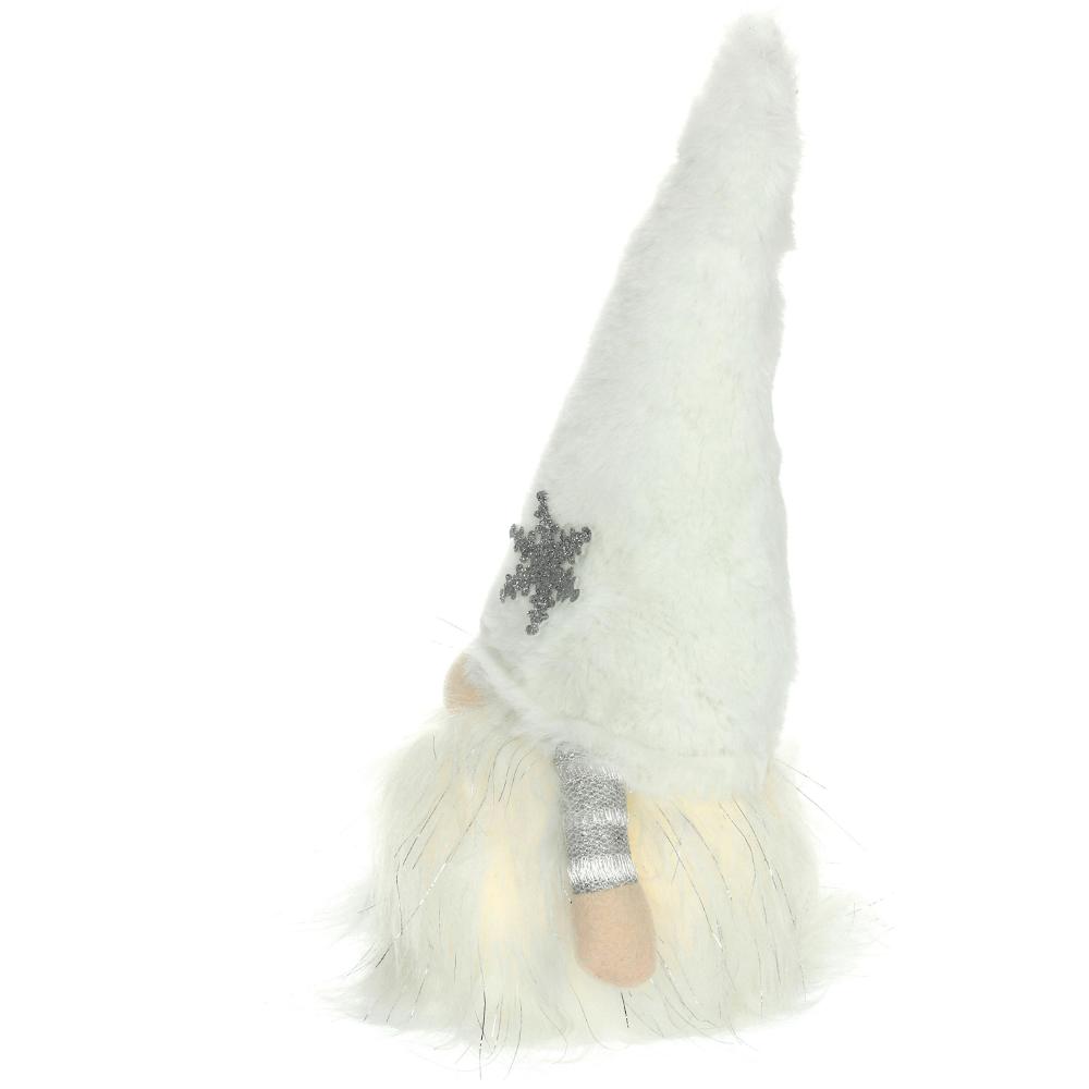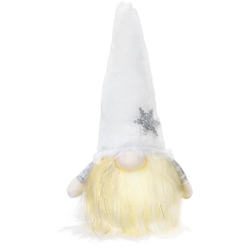 The white textile gnome with a glowing beard. The beard shines with 1 LED in warm white colour. Size 15 x 12 x 27 cm. 3 AAA batteries not included. Use only indoor.