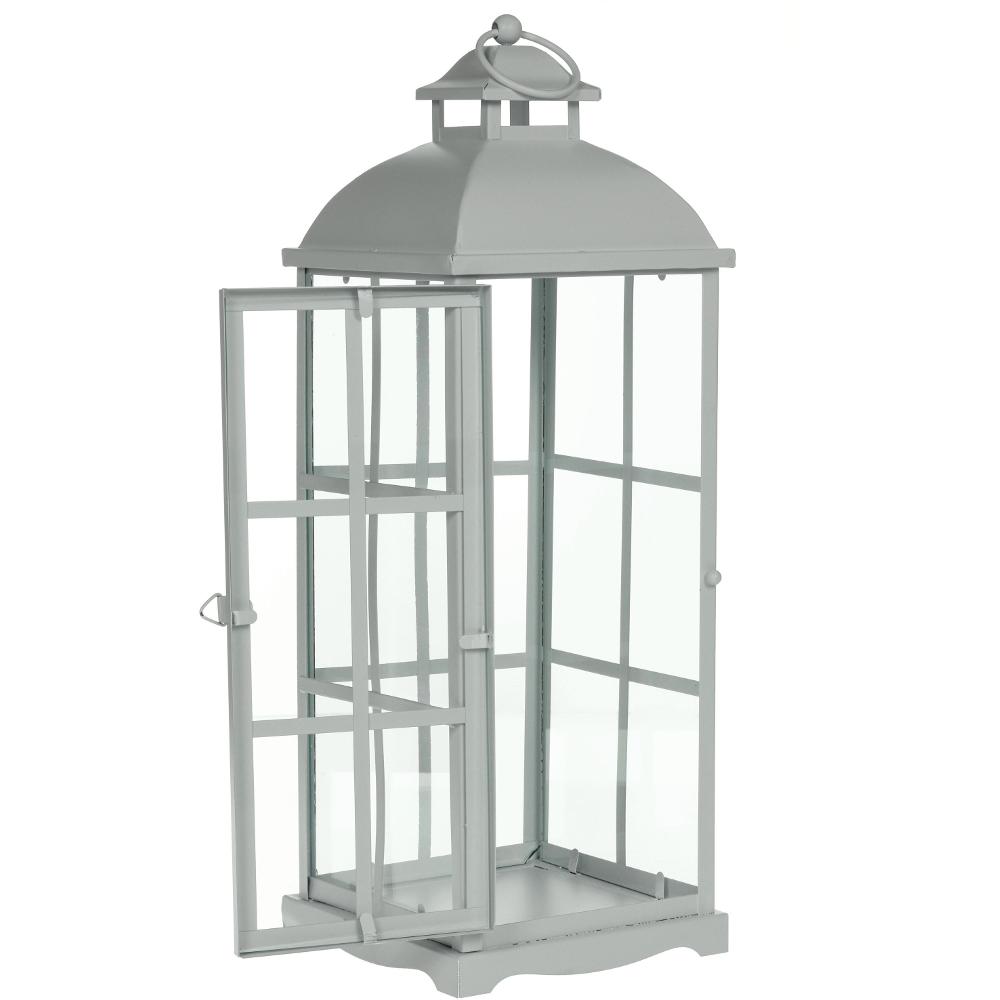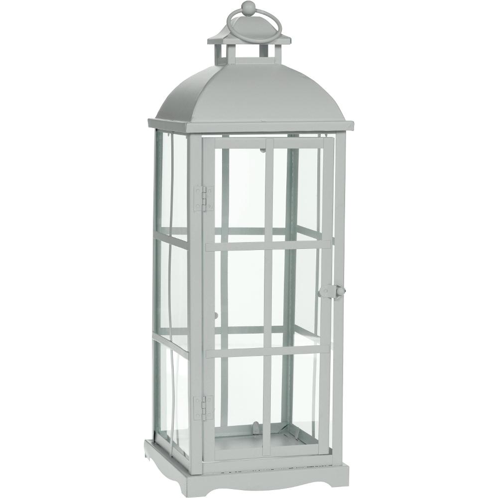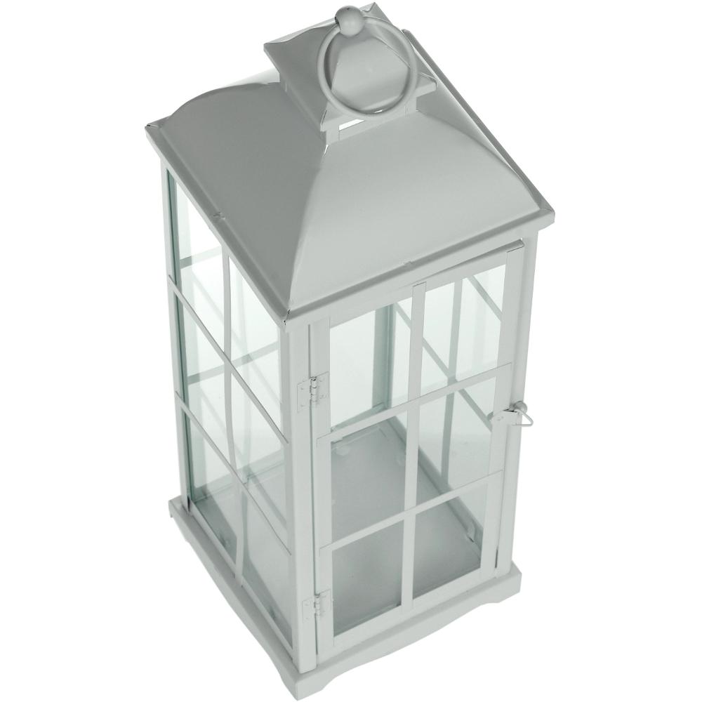 The white metal lantern with plastic windows could be used with the LED or the wax candle. Size 12,5 x 12,5 x 36,5 cm. For indoor and outdoor use.