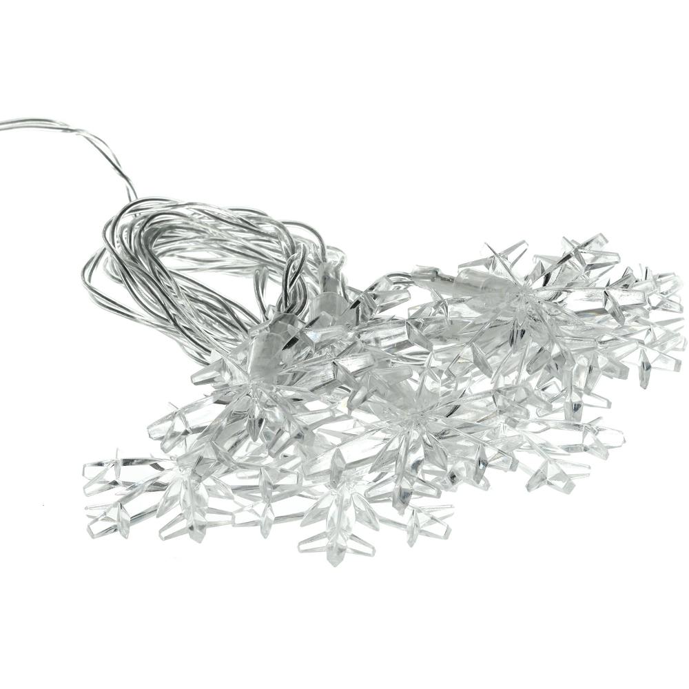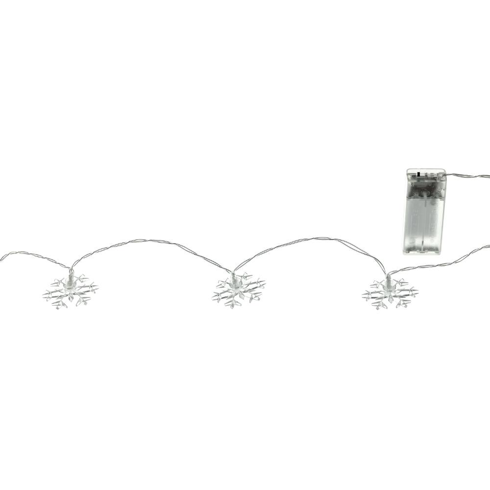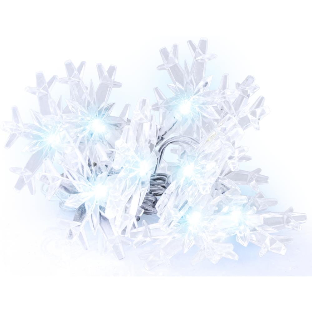 Garland with 10 plastic snowflakes lit up with 10 LED lights in cold white colour. Length of glowing part 1,35 m, size of the snowflake 4,5 cm, 0,3 m power cord. Timer. 2 AA batteries not included. Use only indoor.