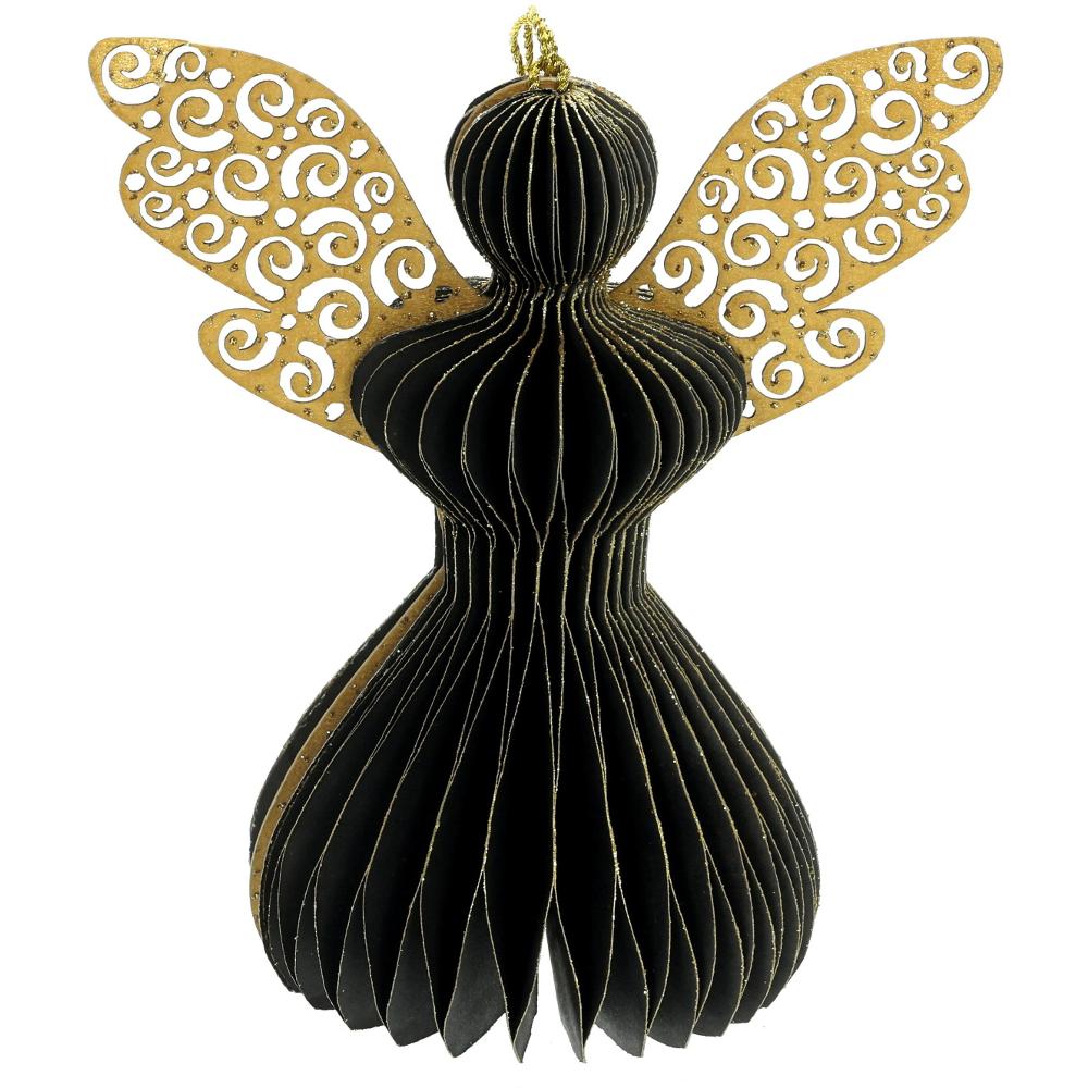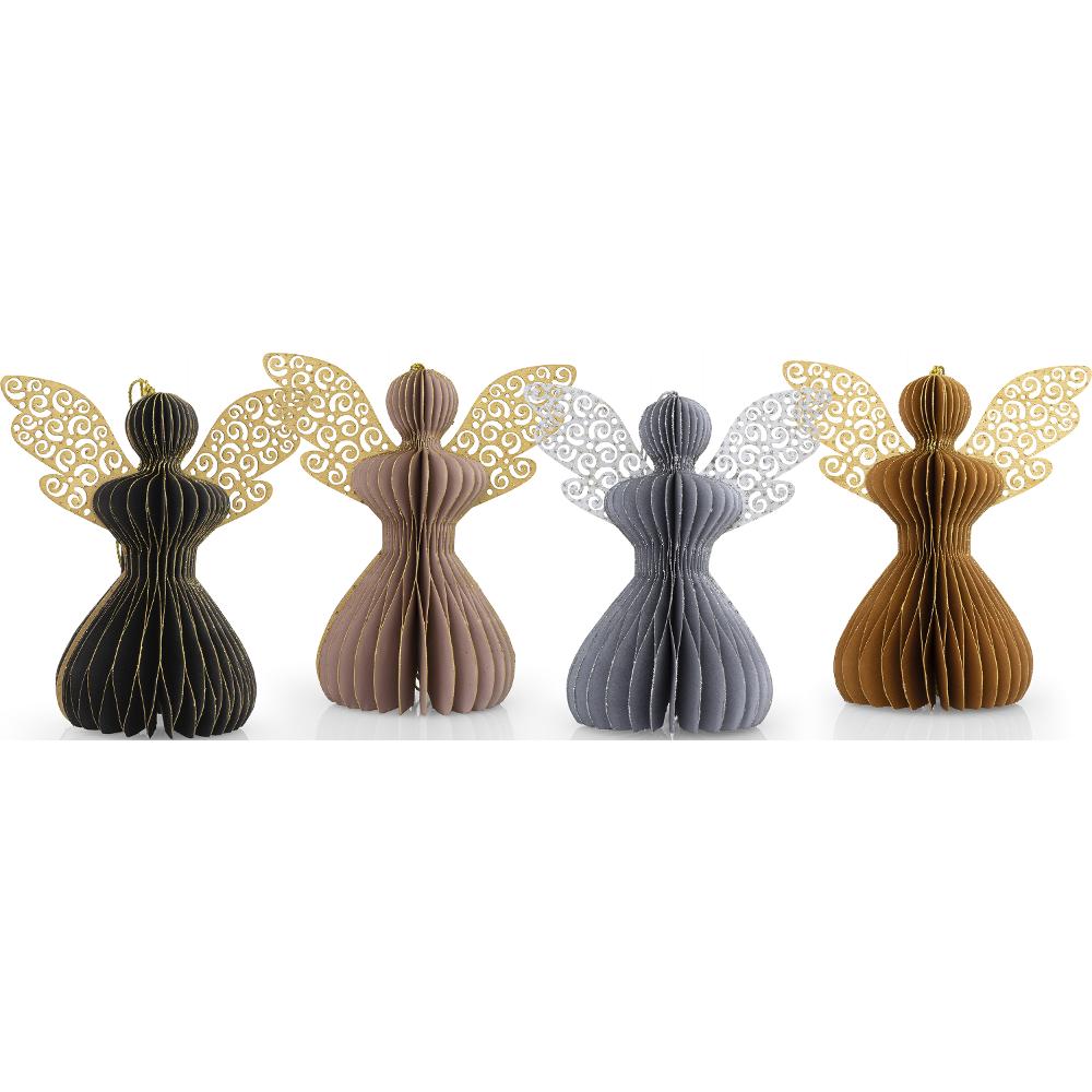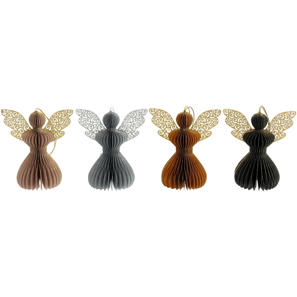 4 beautiful angel ornaments. Honey Comb angels have gold glitters on the edges. The set includes ornaments in four colors black, gold rose,mustard and silver.Use only indoor.