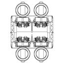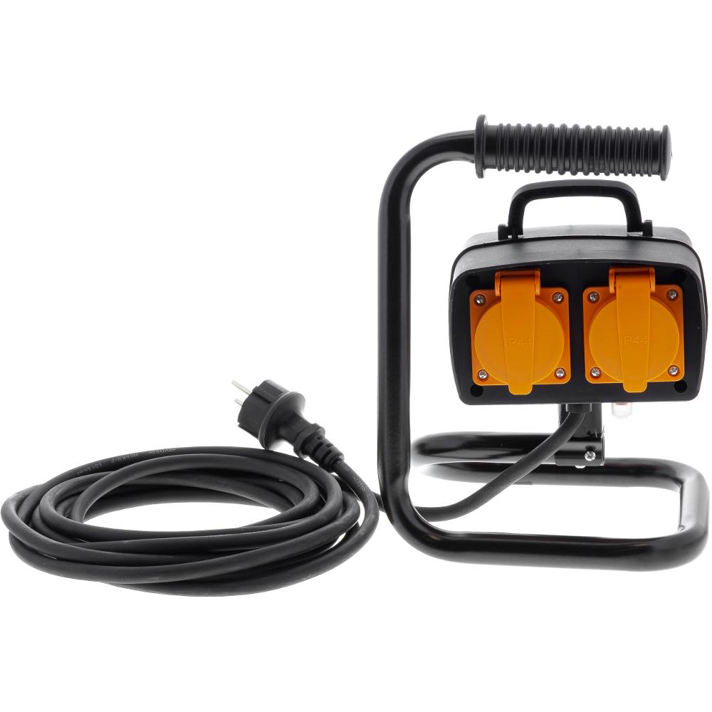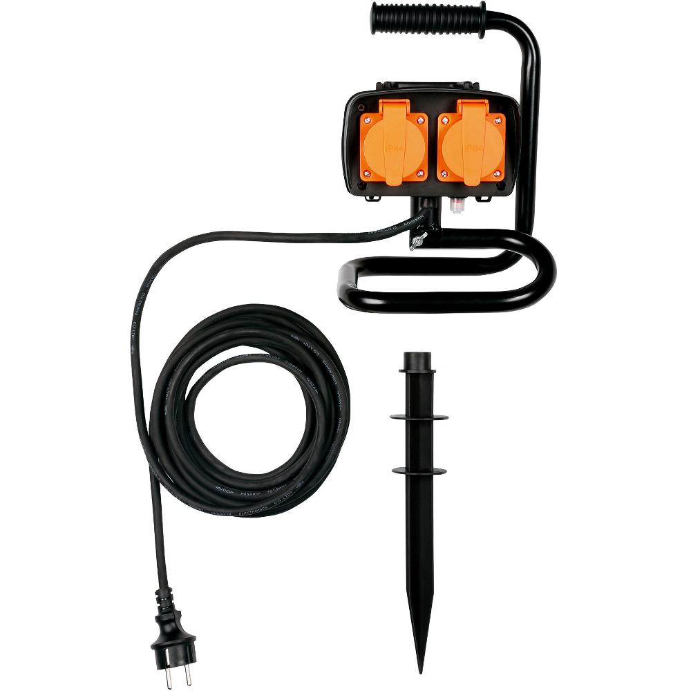 Outdoor cable socket, black/orange colour, IP44, 4x 230 / 16A / max. 3680W, metal stand with avalability to change with plastic spike (in packing),reversible current protection button, with 5 meter cable G3x1,5mm2., french type socket.