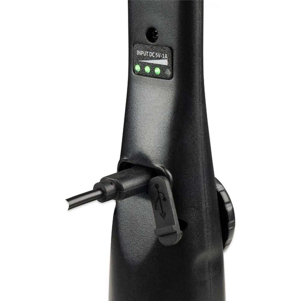 practical metal hanging strap at the top. Other features include a Micro USB Type B connector for convenient charging with a commonly used