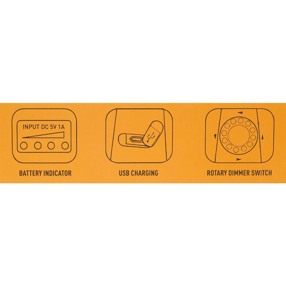such as metal splinters or lubricants gets in. This lamp also has an optical indicator of the remaining capacity through 4 blue diodes. An USB cable is