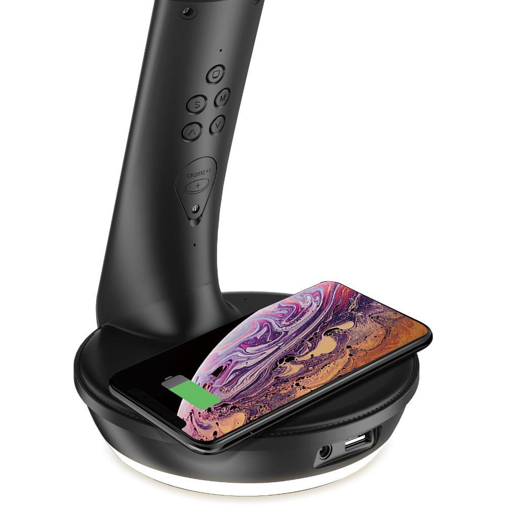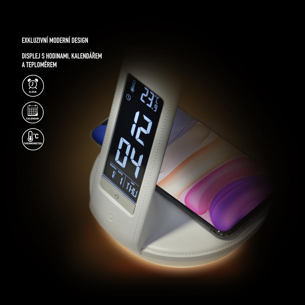 LED stolní lampička s ambientním podvícením, hodinami, kalendářem, teploměrem, bezdrátovým nabíjením Qi a USB výstupem.