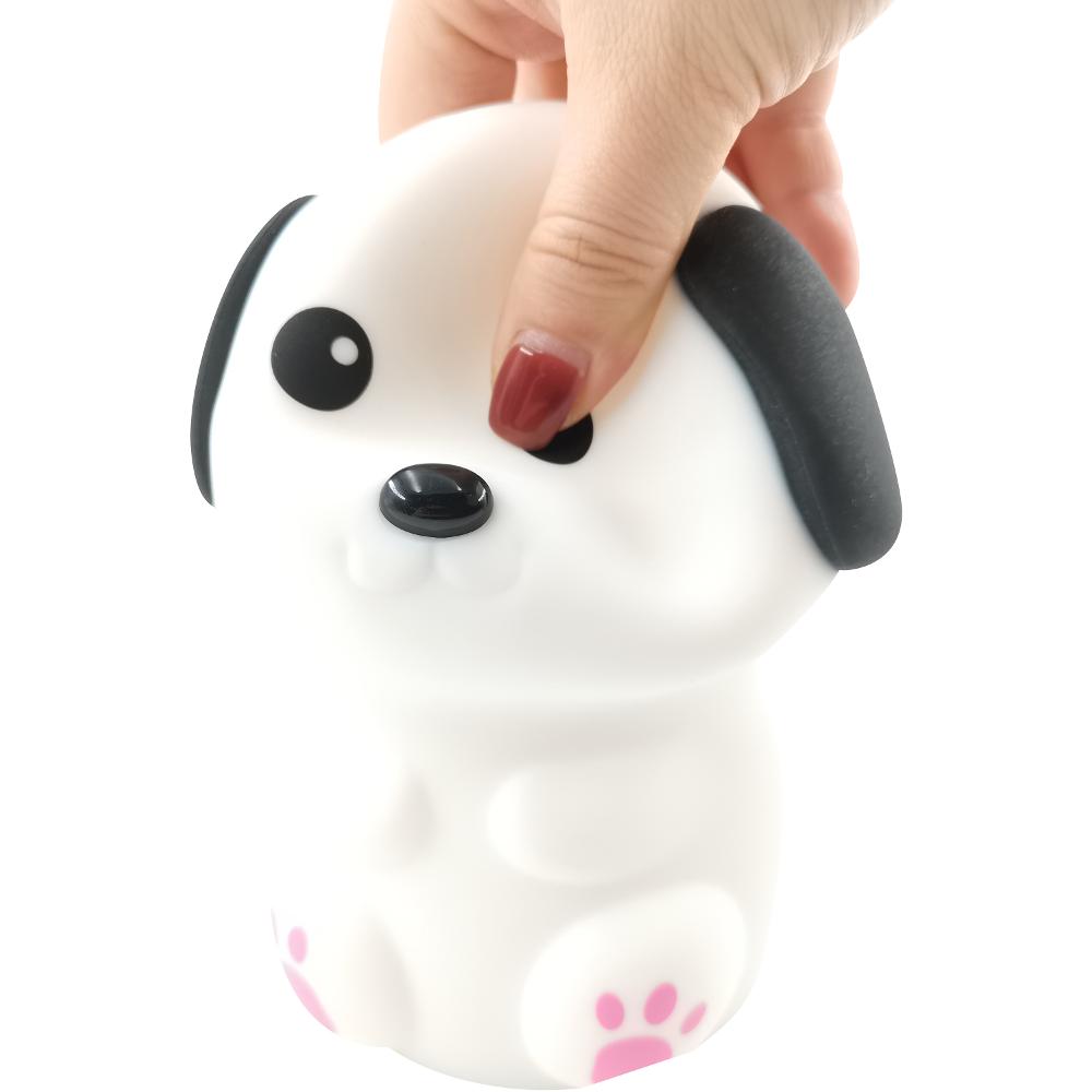 A dog-shaped night light for children with the function of dimming and the possibility of changing the light color. It shines beautifully with evenly distributed softly diffused light and is made of soft silicone.