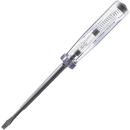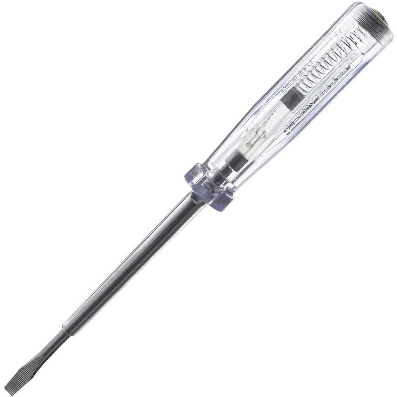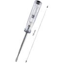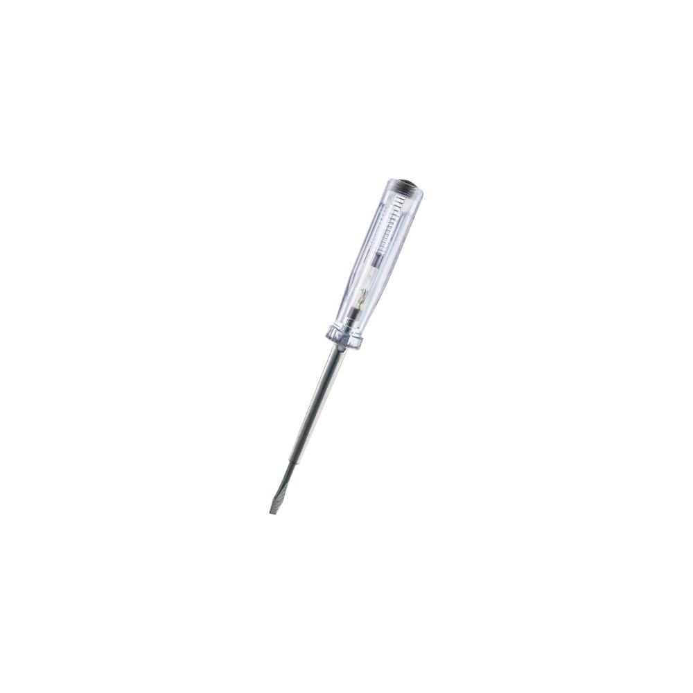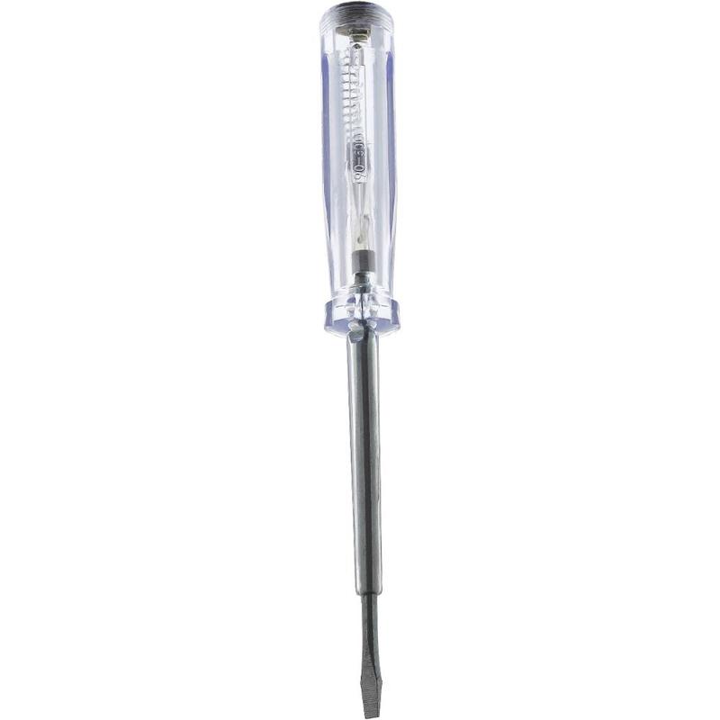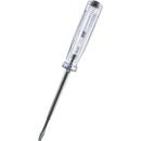 Single pole tester for 220 - 250 V AC. White transparent plastic handle. Test electrode integrated within screwdriver